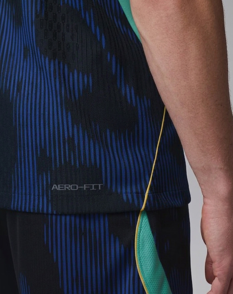 Aggressive Predator Aesthetic: The design features a Royal Blue base layered with jagged, movement-heavy graphics in black and navy, drawing inspiration from Brazil’s most formidable predators.